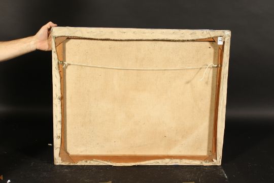 Modern British, a study of carpets hung from a window, oil on canvas, signed, 24" x 30", unframed.