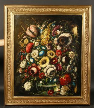 Early 20th century English school, A still life of mixed flowers in a glass bowl, oil on canvas, 30" x 25".