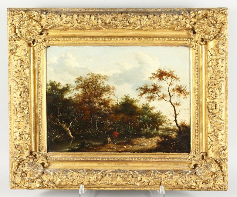 Early 19th century Norwich School, Figures on a riverbank, oil on oak panel, in a fine gilt composition frame, 12" x 15".
