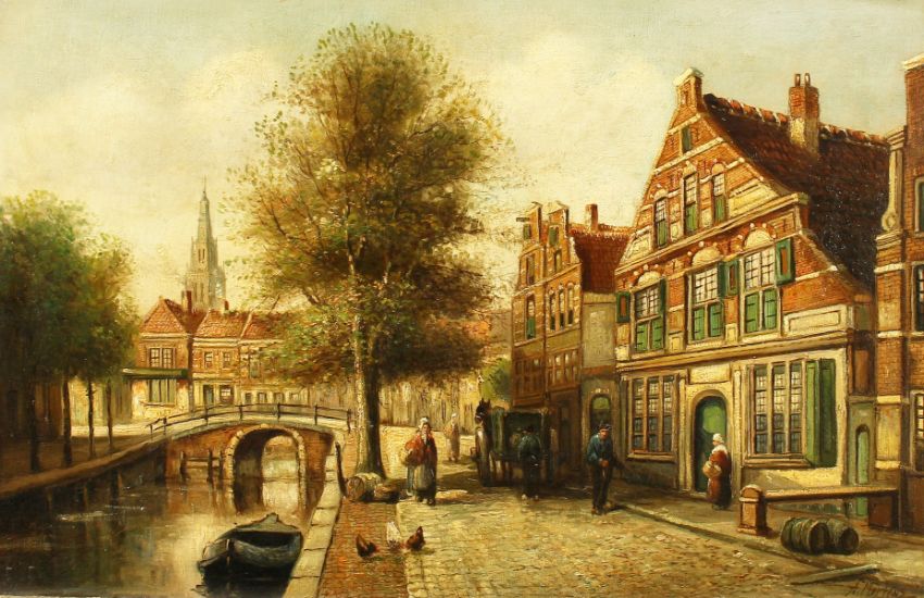 Alfred Martens (20th century school) Dutch, A scene of figures on a frozen waterway by a bridge and another of figures beside a canal, with town buildings, oil on canvas, signed, 19.5" x 30".