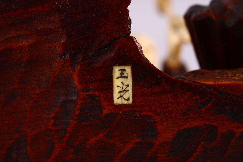 A JAPANESE MEIJI PERIOD CARVED IVORY AND WOOD OKIMONO OF A WOOD CUTTER, stood holding his axe aside a log, with a double gourd bottle in his hand, the underside with an inset ivory carved seal mark, 19cm high x 15cm wide