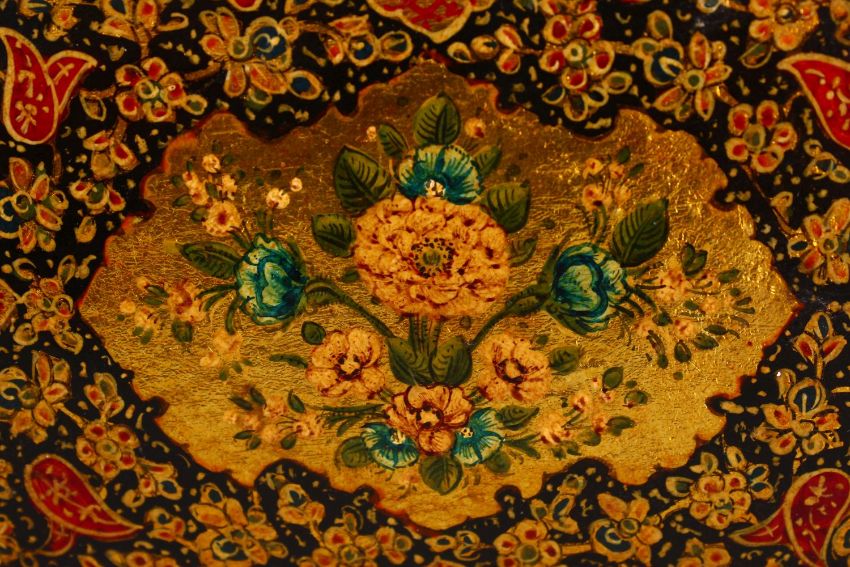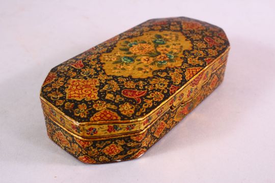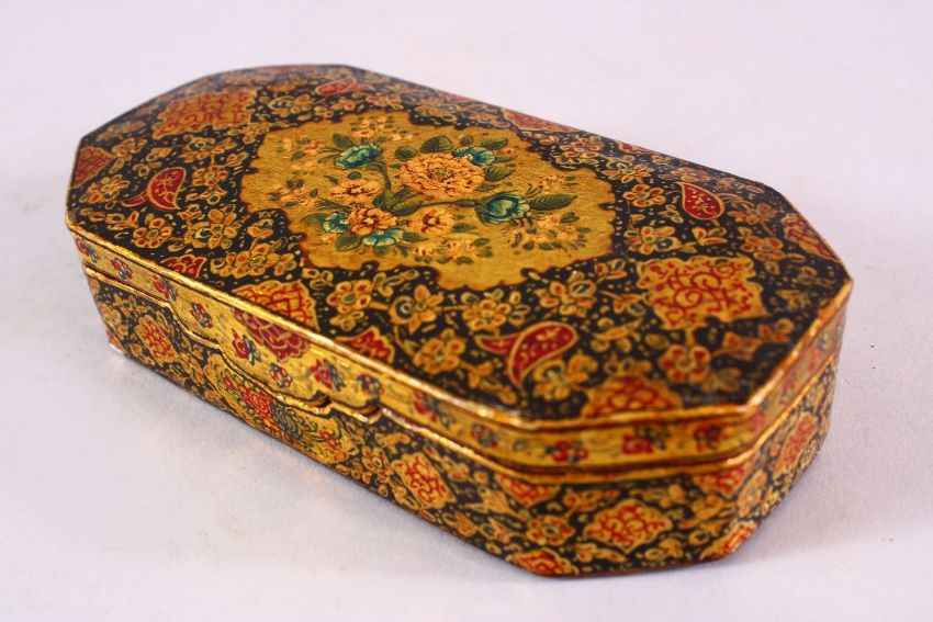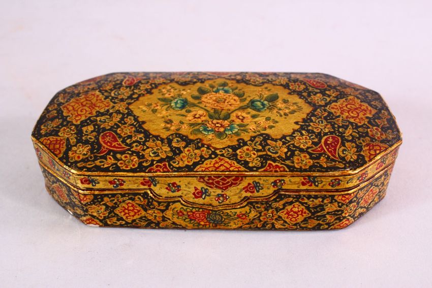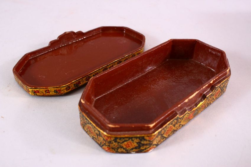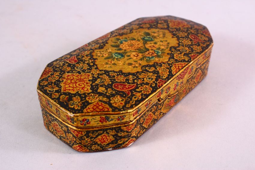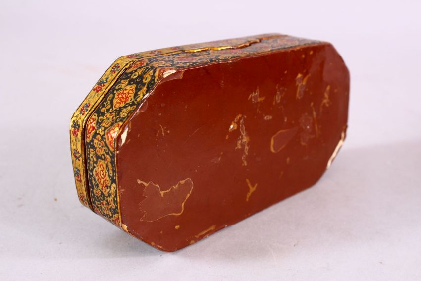 A 19TH CENTURY PERSIAN LACQUER LIDDED BOX, with floral decoration, 14cm x 7cm.