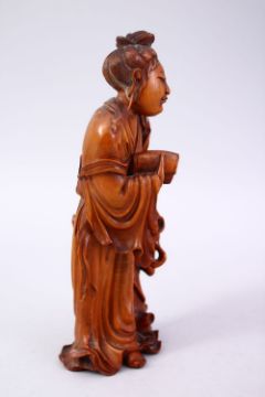 A CHINESE CARVED WOODEN FIGURE OF GUANYIN & ANIMAL, stood aside a tree stump with an a animal, 20cm high.