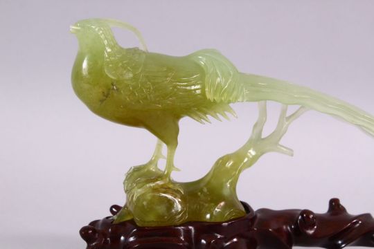 A CHINESE CARVED JADE MODEL OF A PEACOCK, stood upon stylized wooden outcrop, on a carved hardwood base, 15cm high x 20cm wide