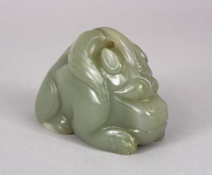 A CHINESE CARVED CELADON JADE FIGURE OF A MYTHICAL BEAST OR DRAGON, 8CM
