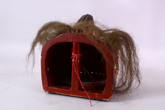 A JAPANESE MEIJI / TAISHO PERIOD LACQUER HANNYA / DEVIL MASK, with real hair detailing, gilt highlights, a moving mouth, 22Ccm high x 19cm wide.