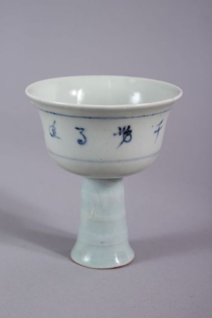 A CHINESE BLUE & WHITE CALLIGRAPHIC PORCELAIN STEM CUP, the body with decoration of calligraphy, 10cm high x 8cm diameter.