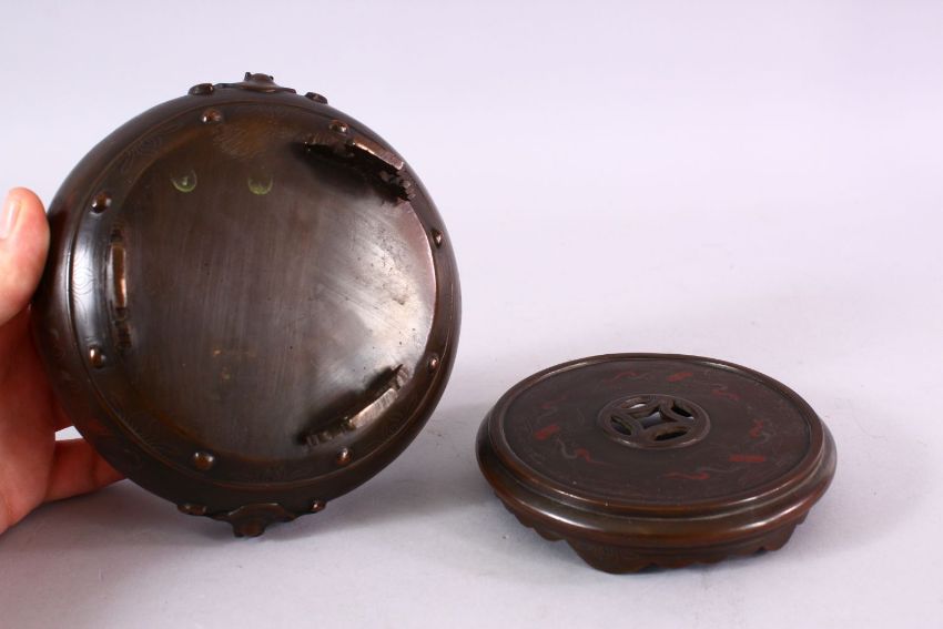 A FINE 19TH CENTURY CHINESE INLAID BRONZE CENSER & STAND, the censer in the form of a squash barrel, with moulded bat handles, with silver inlaid decoration of flora and lotus with a longevity symbol, the base inlaid with scenes of precious objects and treasure centre, 17cm wide x 10cm high.