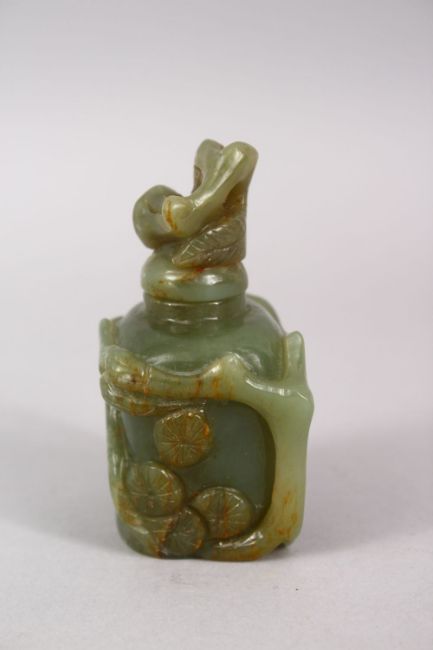 A 19TH / 20TH CENTURY CHINESE CARVED GREEN JADE SNUFF BOTTLE, carved with pine tree decoration,