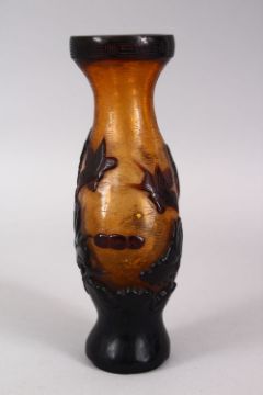 A CHINESE PEKING AMBER GLASS OVERLAID VASE, with birds carp and lotus, base with a seal mark, 17cm.
