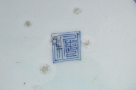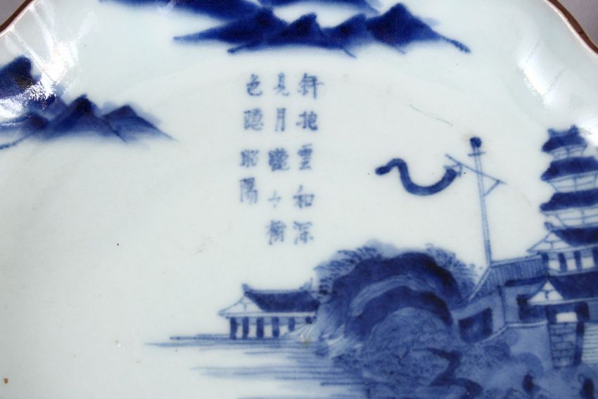 A PAIR OF JAPANESE MEIJI PERIOD BLUE & WHITE ARITA PORCELAIN DISHES, each decorated with native waterside landscape scenes, with central calligraphy, the bases with seal marks, 21cm