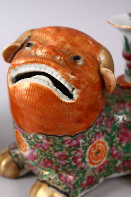 A GOOD PAIR OF 18TH / EARLY 19TH CENTURY CORAL & FAMILLE ROSE PORCELAIN CANDLESTICKS IN THE FORM OF RECUMBENT DOGS, the body finely decorated with scrolling foliate decoration, 17cm wide.