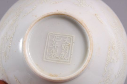 A PAIR OF CHINESE MING STYLE MONOCHROME CARVED PORCELAIN TEA BOWLS, with carved decorations of dragons, amongst stylized waves, the base with six character marks, 9cm