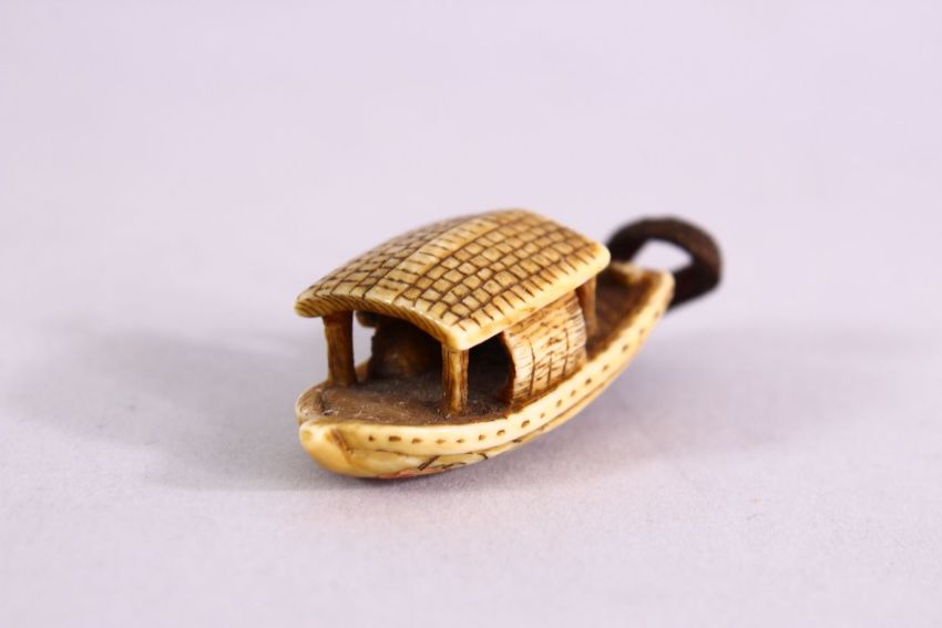 A JAPANESE MEIJI PERIOD CARVED IVORY NETSUKE OF A BOAT - with two carved figures inside, artist signed to the base, 4cm