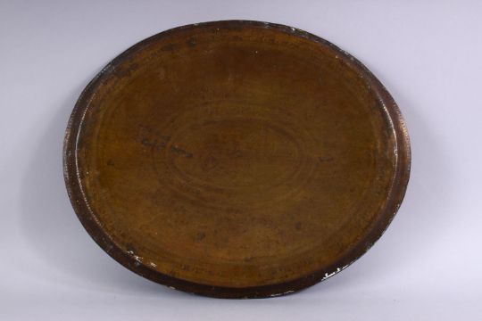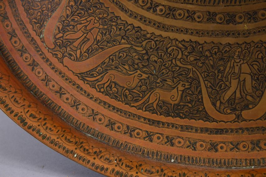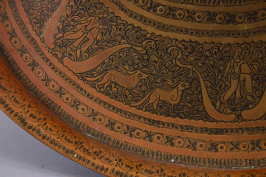 A HEAVY QUALITY CARVED PERSIAN BRASS TRAY, carved with scenes of figures and animals and flora, 43.5cm wide x 35.5cm.