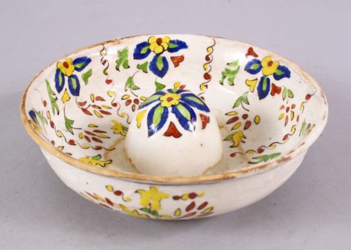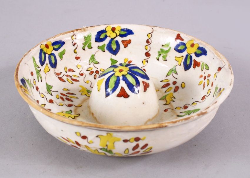 A TURKISH KATAHYA POTTERY LEMON SQUEEZE, WITH BANDS OF FLORAL MOTIF, 16cm diameter.