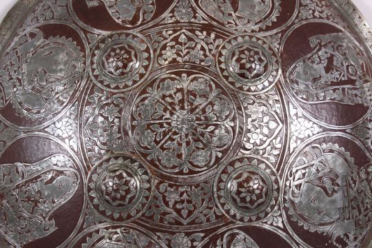 A 19TH / 20TH CENTURY INDIAN MUGHAL SILVER INLAID SHIELD, with figural decoration 46cm diameter.