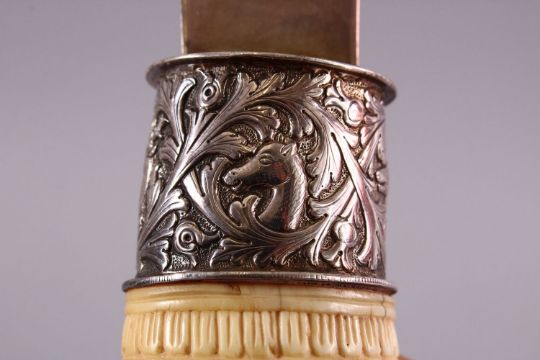 A 19TH CENTURY CARVED INDIAN IVORY MYTHICAL BEAST PAGE TURNER, carved with a mythical beast handle, white metal collar, 29 cm