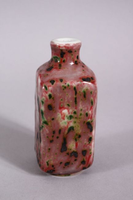 A CHINESE PEACH BLOOM PORCELAIN SNUFF BOTTLE, with a bloom glaze, the base with a fouor character mark, 9cm