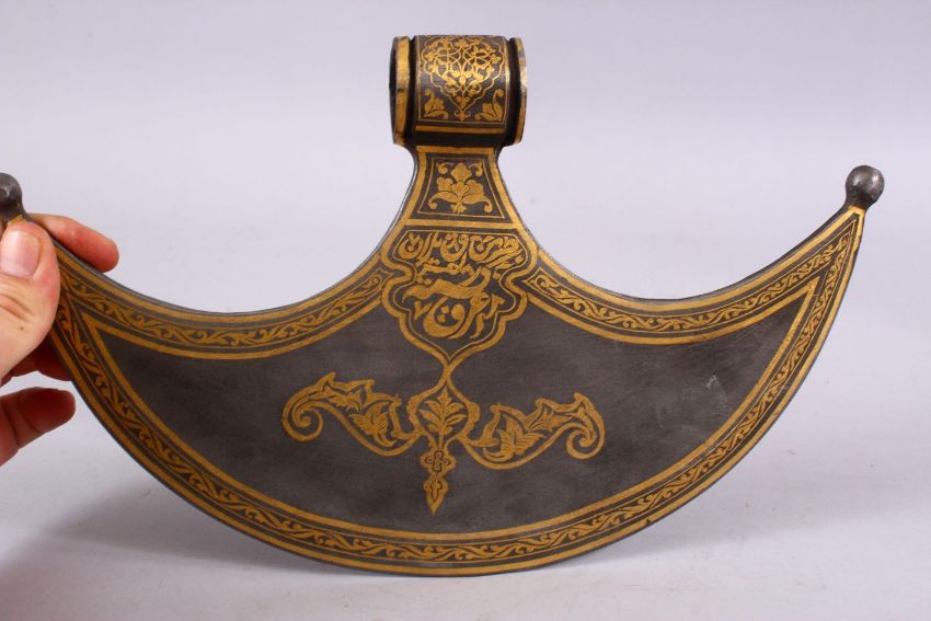 AN OTTOMAN ISLAMIC GOLD INLAID IRON AXE HEAD , with gold inlay of borders and calligraphy, 30cm