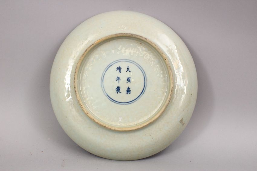 A 19TH / 20TH CENTURY CHINESE BLUE & WHITE PORCELAIN DRAGON DISH, with three five claw dragons, the verso with six character wanli mark, 27cm.