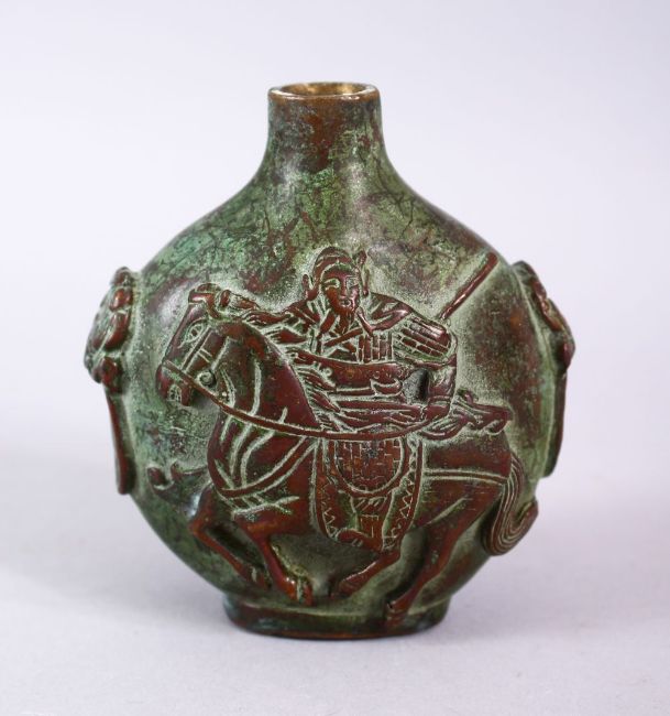 A CHINESE BRONZE TWIN HANDLE VASE OF FIGURE UPON HORSEBACK, the vase with twin moulded handles, with onlaid scenes of figures upon horseback, 10cm x 9cm