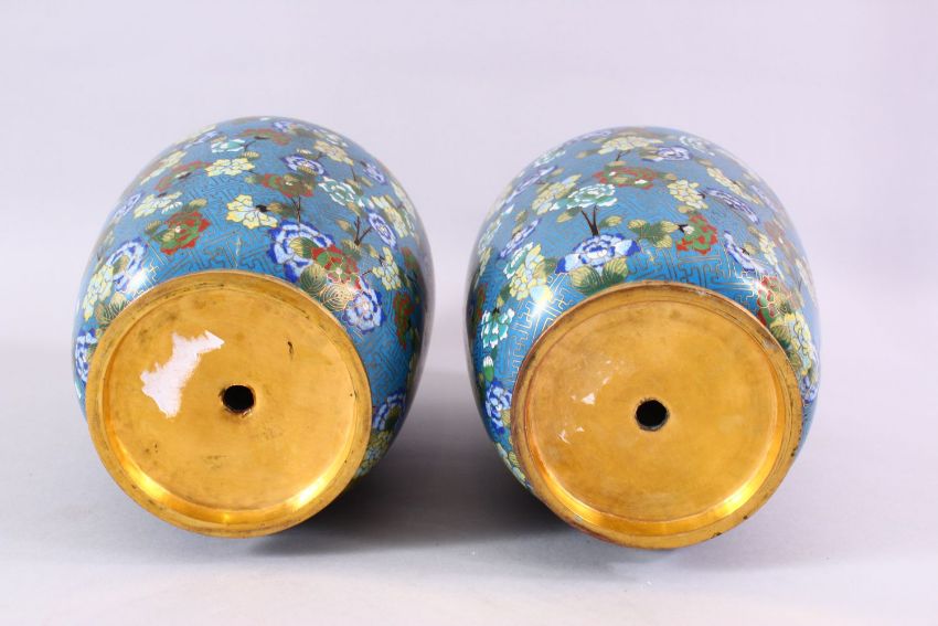 A LARGE PAIR OF 19TH / 20TH CENTURY CHINESE CLOISONNE VASES, each decorate with an array of flora and butterflies upon a blue ground with metal rims, bases drilled, 26cm high