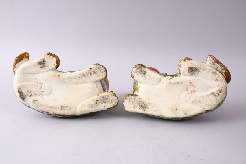A GOOD PAIR OF 19TH CENTURY CHINESE CORAL & FAMILLE ROSE PORCELAIN CANDLESTICKS IN THE FORM OF RECUMBENT DOGS, with floral and butterfly decoration, 16cm wide,