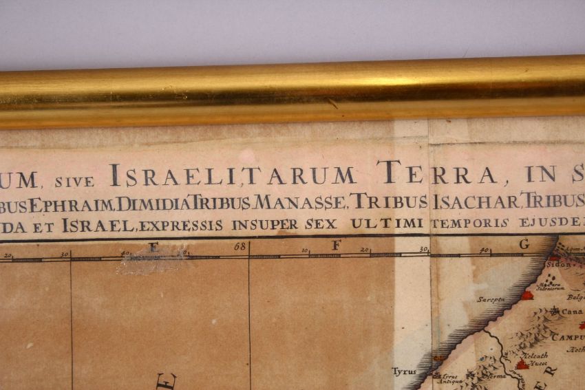 A SUPERB 17TH CENTURY HAND COLOURED PICTORIAL MAP OF THE HOLY LAND ISRAEL, PALESTINE [BY SANSON, JAILOT] 'JUDEA SEA TERRA SANCTA QUAE HEBRAEORUM SIVE ISRAELITARUM', gifted to Mrs Golda Meir; the former Prime Minister of Israel by Mr Trevor Chinn; chairman of the JIA campaign committee on behalf of the Joint Israel Appeal, 63.5cm x 93.5cm.