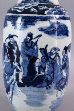 AN 18TH / 19TH CENTURY CHINESE BLUE & WHITE PORCELAIN VASE, decorated with scenes of seated immortal figures in a landscape, mark to base, 39cm.