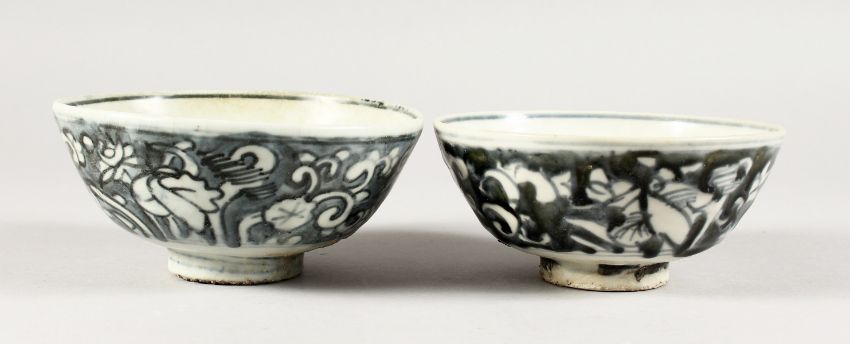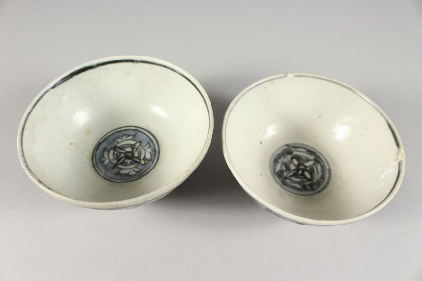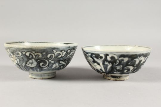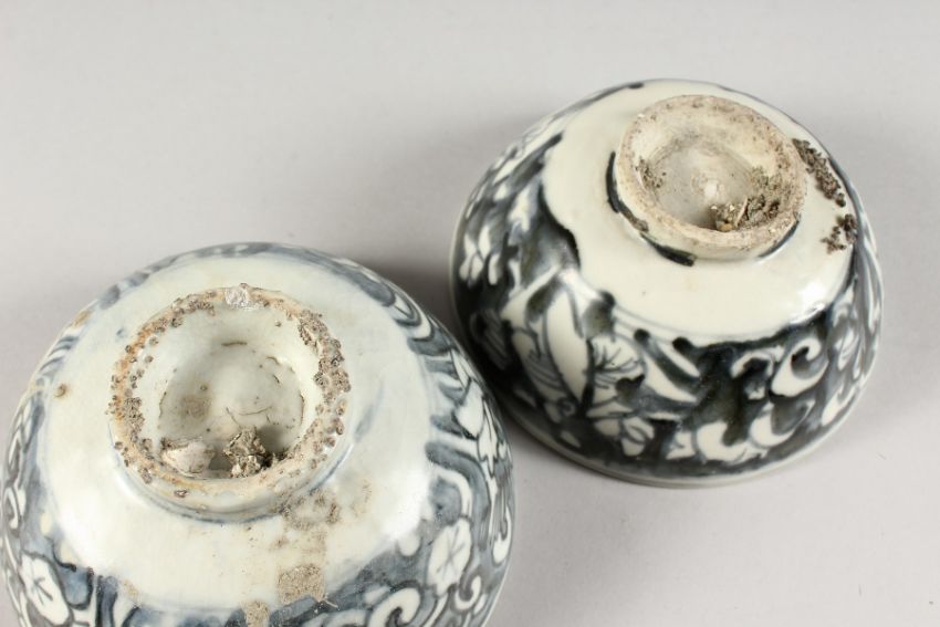 TWO CHINESE KANGXI PERIOD SHIPWRECK BLUE AND WHITE TEA BOWLS.