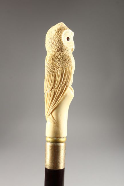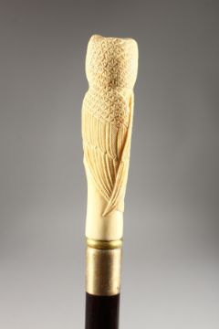A CARVED BONE HANDLED WALKING STICK, OWL.