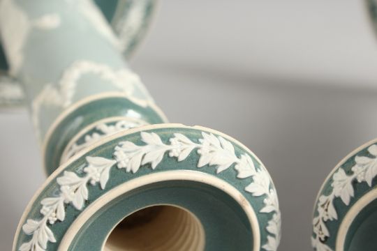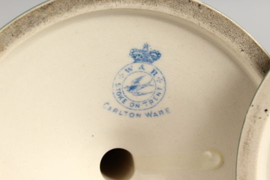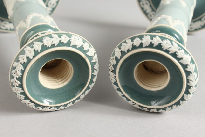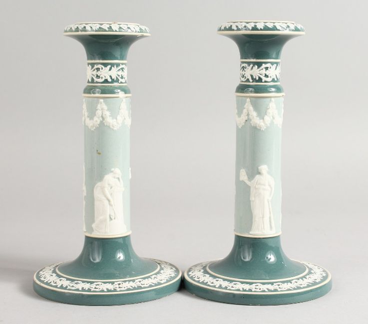 A PAIR OF CARLTON WARE JASPER CIRCULAR CANDLESTICKS on circular bases. Printed mark.