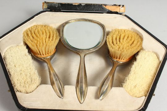 A GUILLOCHE ENAMEL AND SILVER FIVE-PIECE DRESSING TABLE SET, in a fitted case (lacking comb).