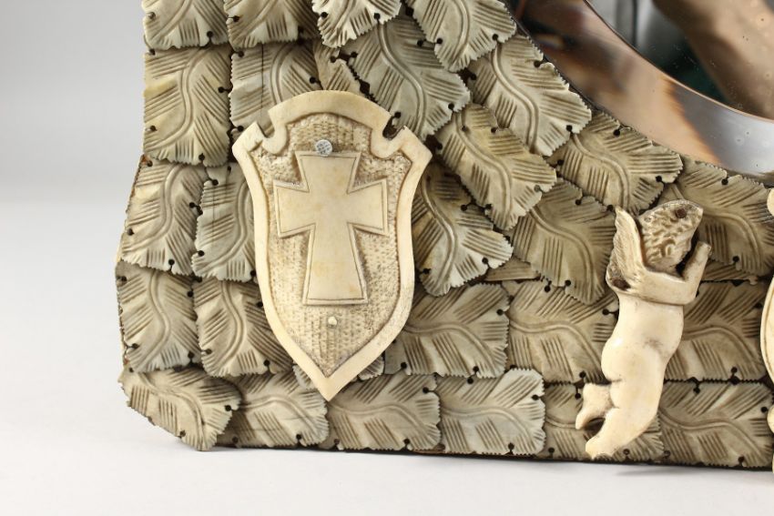 A GOOD DIEPPE PRISONER OF WAR CARVED BONE MIRROR, CIRCA. 1860, with emblems, shields, etc., with oval mirrored panel.
