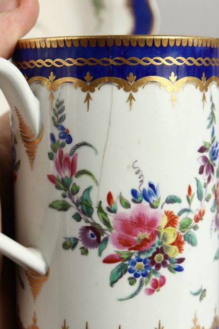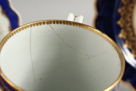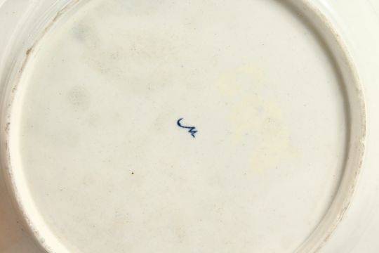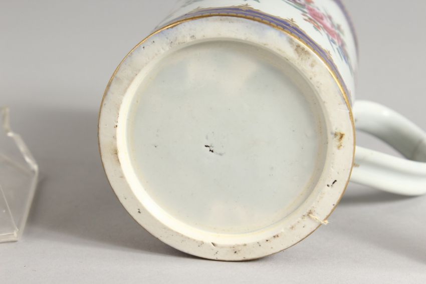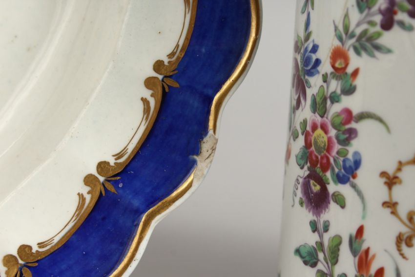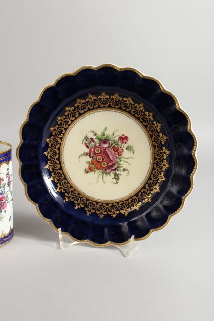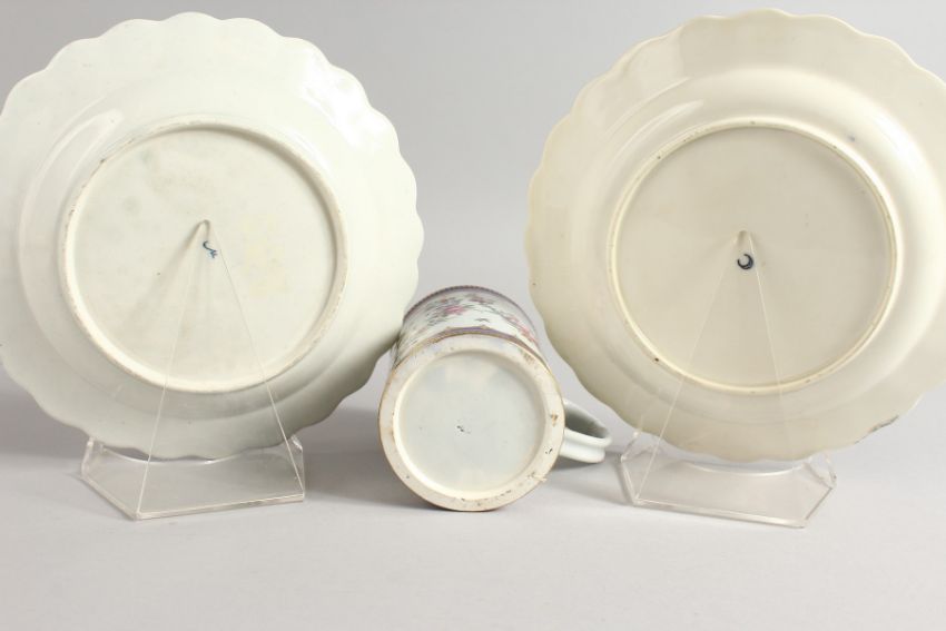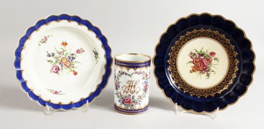 A WORCESTER BEAUTIFUL MUG fine painted with flowers and having the initials HC and two Worcester plates, one with a blue border and on wet blue.