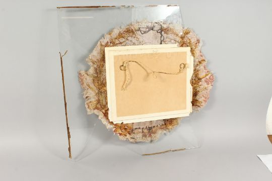 A CIRCULAR SILKWORK PICTURE, depicting Eve (?), mounted onto glass. Silkwork: 18ins diameter.