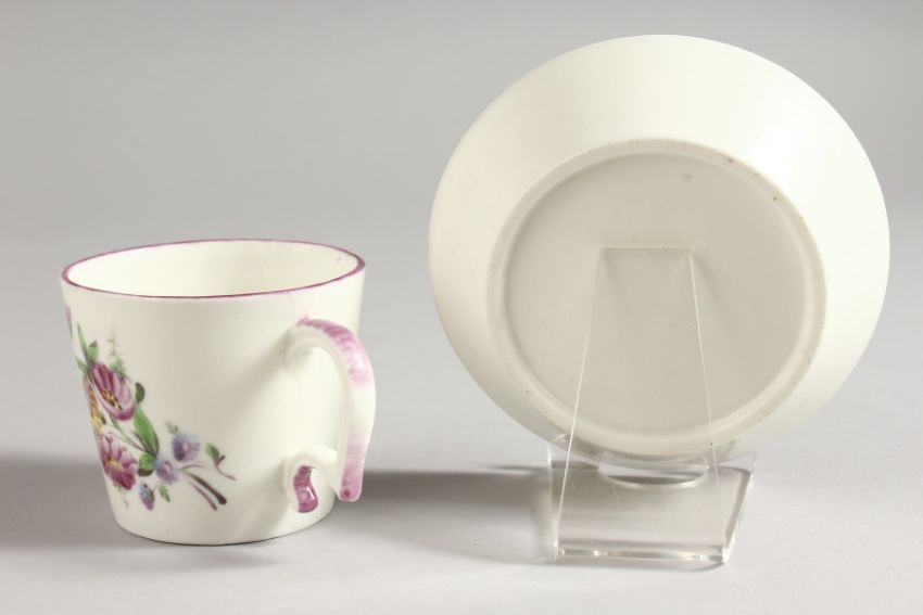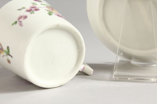 AN 18TH CENTURY MENNECY CUP AND SAUCER painted with flowers.