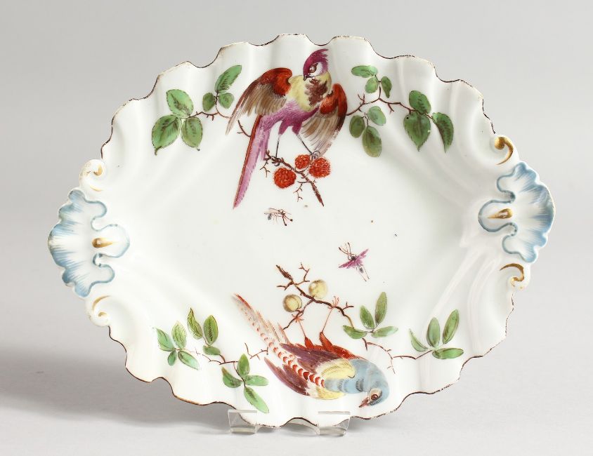 A CHELSEA SILVER SHAPED OVAL DISH painted with birds, red anchor mark.