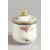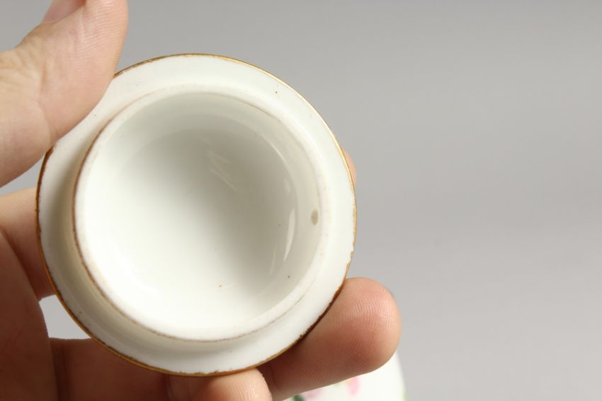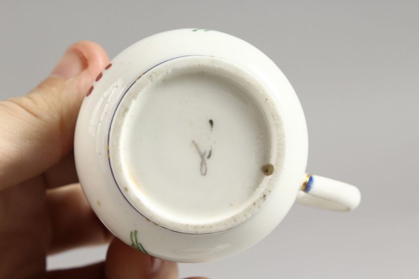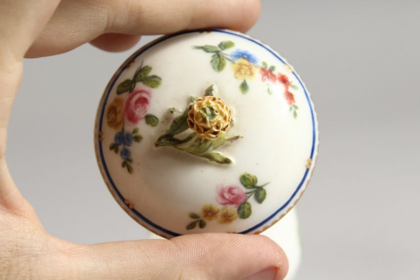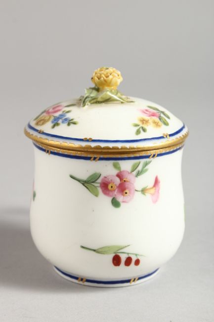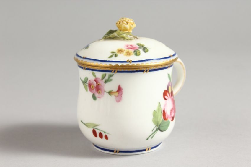 A SEVRES CUSTARD CUP AND COVER painted with flowers under a blue line and dentil gilt border.