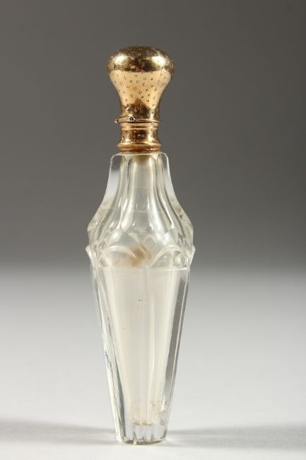 A GLASS GOLD TOP SCENT BOTTLE AND STOPPER.