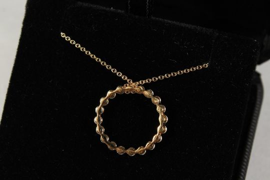 A GOOD 18CT YELLOW GOLD DIAMOND HOOP PENDANT on a chain.