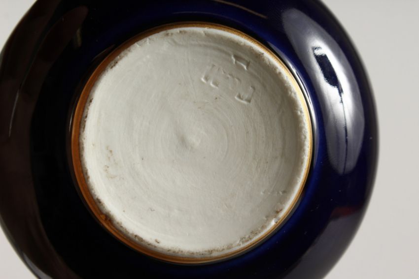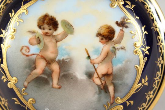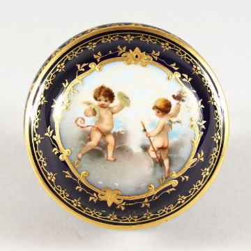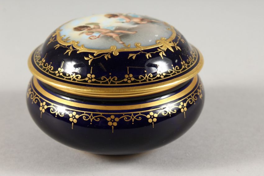 A CONTINENTAL RICH BLUE PORCELAIN CIRCULAR BOX AND COVER, the lid with cupids.