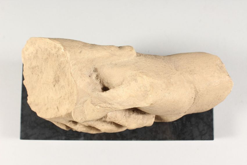 A POTTERY SCULPTURE OF CLASPED HANDS, on a marble base.