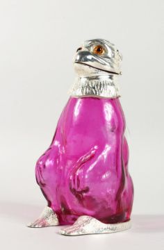 A NOVELTY CRANBERRY COLOURED GLASS SEATED MONKEY CLARET JUG, with plated mounts.