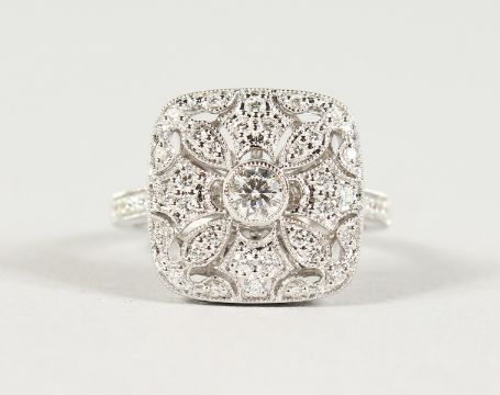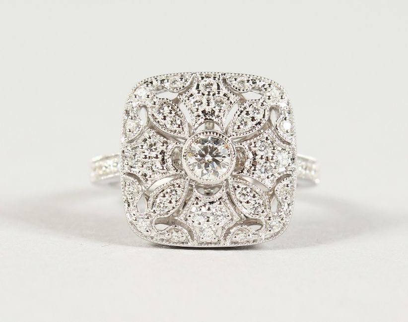 A GOOD 18CT WHITE GOLD ART DECO DESIGN DIAMOND RING.