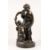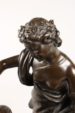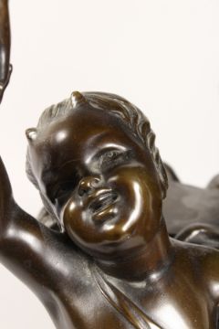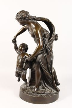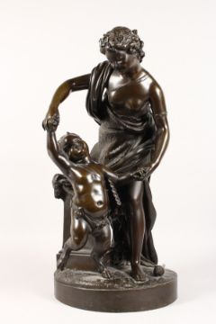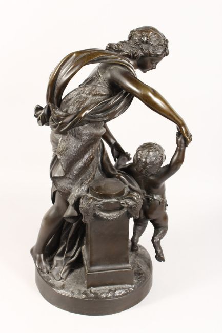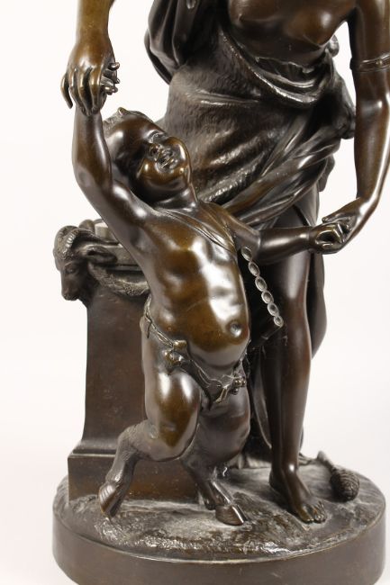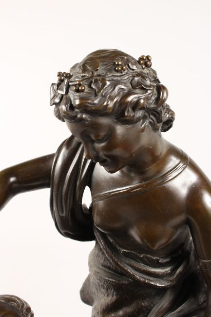 A VERY GOOD LARGE 19TH CENTURY BRONZE GROUP, a classical semi-clad young lady with a faun with pan pipes dancing beside a column, on a circular base.