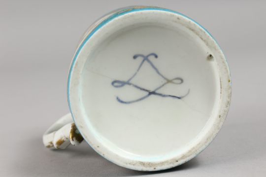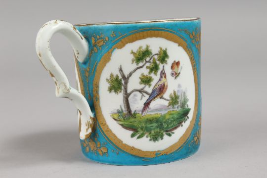 A SMALL LATE 18TH/EARLY 19TH CENTURY SEVRES MUG, painted with three oval panels of birds in a landscape.