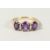 A 9CT GOLD THREE STONE OVAL AMETHYST AND DIAMOND RING.