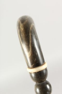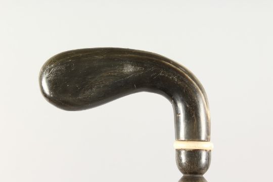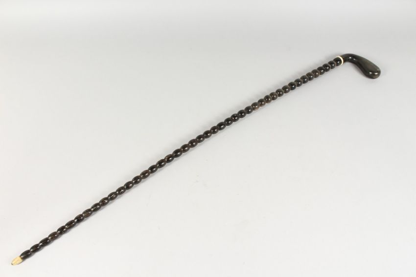 A 19TH CENTURY BOBBIN TURNED WALKING STICK with RHINO HANDLE.